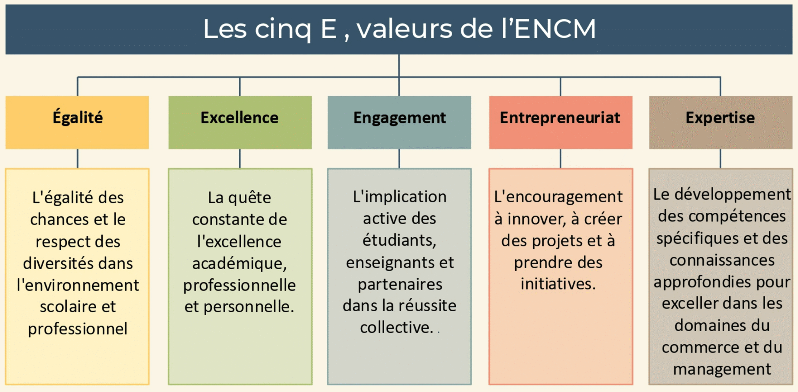 Les cinq « E » représentent les valeurs fondamentales de l’École Nationale de Commerce et de Management (ENCM). Ces principes structurent la manière dont nous accompagnons les étudiants et inspirent nos choix pédagogiques au quotidien.